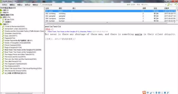 Kindle比较好的一点就是可以看到生词即点即查,而且你查过的生词它会自动帮你收集到自带的生词本里,简直方便到哭啊有没有!但是!这还不是最方便的,有一个电脑端软件叫kindle mate,这款软件到底有多强大?它可以将你在kindle查过的生词批量导出,这样你就可以直接将生词再导入欧路词典里了,简直太感人了。