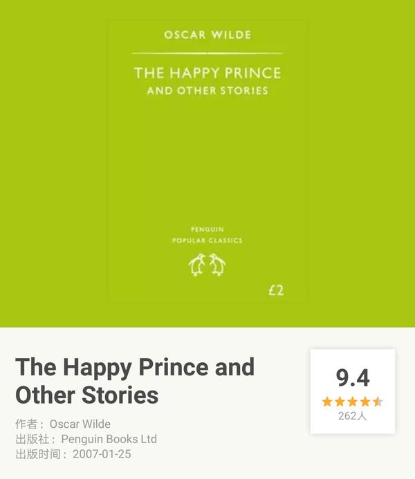 王尔德的童话。其实这本书的整体难度不大,更适合放在一星难度里,但是因为王尔德他老人家啊,描写风景时总是喜欢写各种奇花异果,用一些非常生僻的词汇。这些词汇不查的话其实也不影响大致情节,但是读王尔德的童话就是要感受他笔下的唯美嘛,单单粗略了解大致情节而不去感受字里行间的唯美,其实是有些暴殄天物了。所以思虑再三,把这本书放到了二星难度行列。